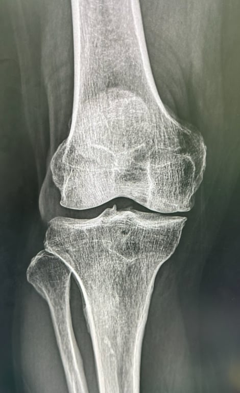醫師會透過詳細的病史詢問、膝關節的理學檢查(觸診、活動度測試)來初步評估。X光檢查是診斷退化性膝關節炎最主要的影像工具,可以清楚看到關節間隙變窄、骨刺形成、軟骨下骨硬化等退化徵象。